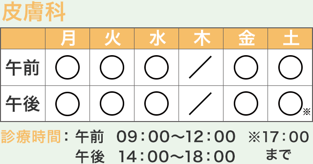 アレルギー疾患、蕁麻疹(じんましん)、水虫、ホクロ、シミ、巻き爪、火傷(やけど)、あざ、掌蹠膿疱症、乾癬、角化症、掻痒症、にきび治療、アトピー性皮膚炎、いぼ(ウイルス性 手足に多い)の治療、AGA(男性型脱毛症)、褥瘡(床ずれ)など